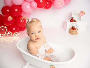 Bij optie 2 worden er cakesmash-foto's gemaakt, dit zijn foto's van jouw kleintje die de taart smasht. Daarna mag jouw kleintje bubbelen in het badje!